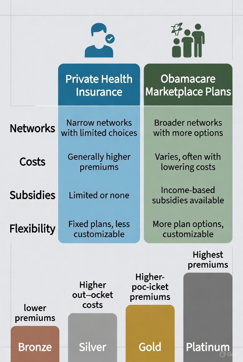 Private health insurance and Obamacare marketplace plans both provide ways to get health coverage in the USA, but they serve different needs. Private plans offer flexibility and variety, while marketplace plans provide federal consumer protections and financial help for eligible individuals and families.
